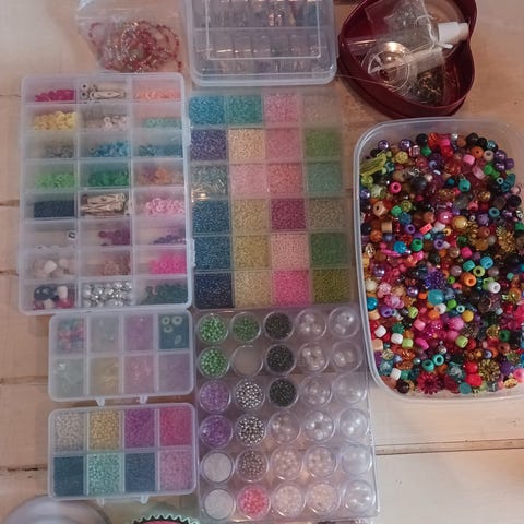 Smykesett bestående av flere halskjeder og øredobber med perler i ulike farger og design. Settet inkluderer både enkeltstående øredobber og matchende halskjeder, egnet for ulike anledninger.