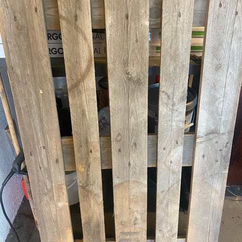 Gulvlist i tre. 139 cm lang. 5 cm høy. Godt brukt.