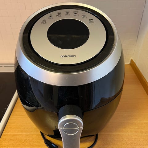 Andersson Airfryer med digitalt kontrollpanel og temperaturvisning. Designet i svart og sølvfarge med håndtak for enkel bruk. Egnet for tilberedning av mat med varmluftsteknologi.