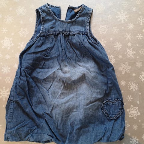 Hust & Claire kjole i størrelse 80. Kjolen er blå og laget av bomull. Den har korte ermer med volanger og dekorative hvite striper på ermer og nederst på kjolen. Knappelukking på baksiden.