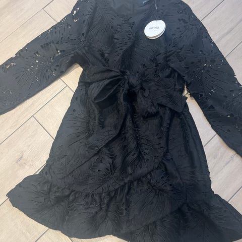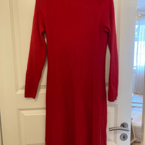 Kjolen er i en mørk flott rødfarge. Kjolen har rund hals, lange slanke armer og faller med litt vidde i skjørtet. Det er stikk lommer i sidene. Kjolen er brukt en gang - og er som ny. Legger ved bilde av tilsvarende kjole som nå er på salg hvor også nyprisen fremkommer. Jeg selger min for kr 1100,-
