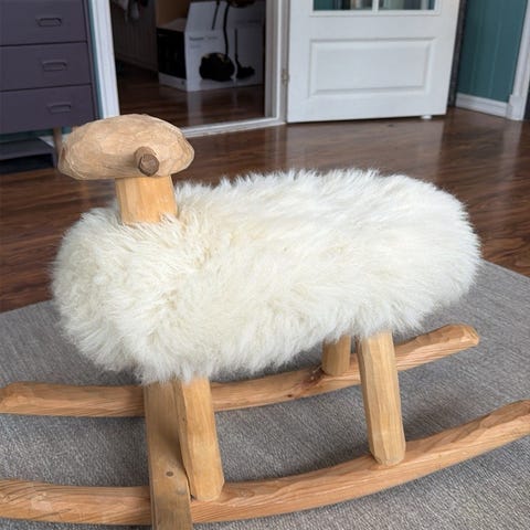 Gyngesau i tre og pelsimitasjon fått i dåpsgave.