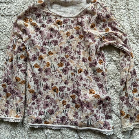 Veldig fin merinoull genser fra Name it. Kjøpt ny og brukt av 1 jente 😊 Rosa farge med blomster. Har samme genser i beige farge med blomster. Str.110 - 5 år.