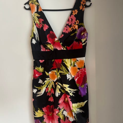 Nydelig svarthvit kjole med blomsterprint i størrelse small. Kjolen har en innsvingt silhuett, delvis åpen rygg, glidelåsåpning i siden, knepping i nakken og underskjørt. Veldig elegant kjole som dessverre er for liten for meg nå. Ingen bruksmerker og er helt nyvasket. 100% bomull med underskjørt i 100% polyester. Veldig fin både sommer og vinter med f.eks sorte strømpebukser til. 😊