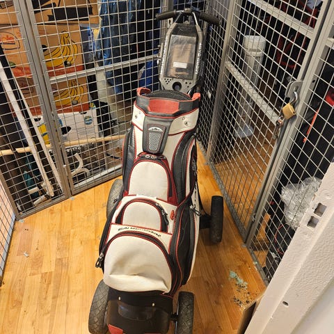 Sun Mountain FOUR 5 golfbag i svart farge. Golfbaggen har flere oppbevaringslommer og en delt topp med flere seksjoner for å organisere golfkøllene dine. Staven som treffer bakken for å få beinene på golfbagen til å gå ut er knekt helt nederst men funker forsatt fint.