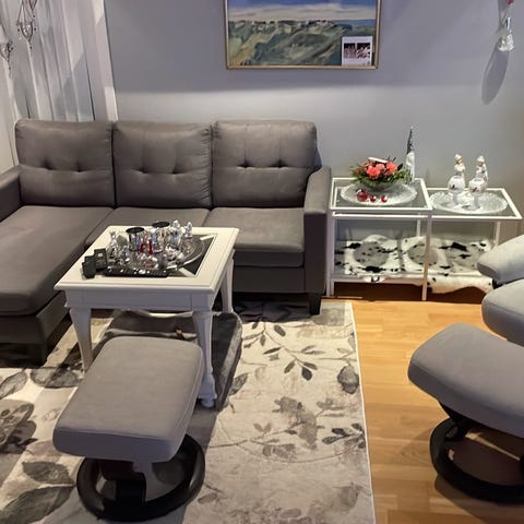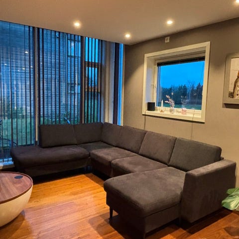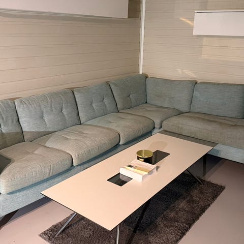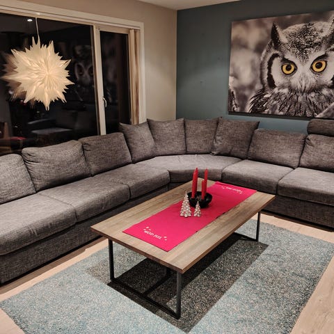 Fin sort hjørnesofa med elektrisk utskyvedel i enden.