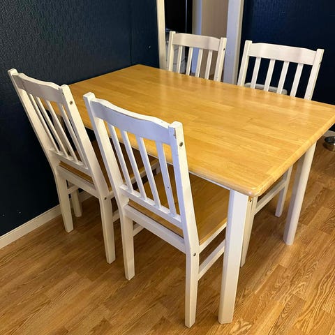 Spisebord og 5 stoler. 4 av stolene er nettopp trekt opp med møbelstoff. Slik bilde 3 viser.