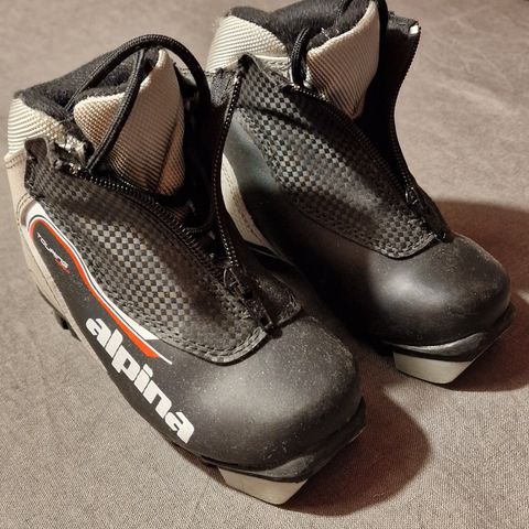 Alpina skisko i størrelse 26. Skoene er kun brukt noen få korte turer av et barn. Fremstår som nye bortsett fra noen små merker under skoen fremme ved tåa. (Se bilde)