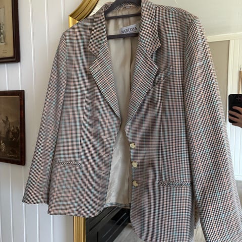 Klassisk oversized blazer/dressjakke til dame fra HM i størrelse L. Oversized og stor i størrelsen, kanskje mer størrelse XL (se cm mål) Enkeltspent, lukkes med 2 knapper. Lommer med klaff. Hundetannsmønstret/beige. Dressjakken er brukt 2 ganger og har ingen bruksmerker.