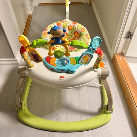 Fisher Price hoppestol med aktivitetsleker. Lyd og lys. Sete kan justeres i flere høyder etter barnet. Har et mykt sete som kan vaskes i maskin.