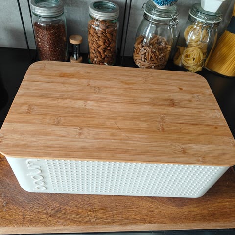 Bodum brødboks med svart kropp og lokk i bambus. Brødboksen har en romslig innside for oppbevaring av brød og bakervarer, og lokket kan også brukes som skjærebrett. Materiale