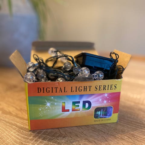 Ubrukt lysslynge. Kjøpt på Clas Ohlson: https://www.clasohlson.com/no/Solcelledrevet-lysslynge-med-lyspaerer/p/36-6177