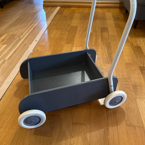 Godt brukt gå-vogn for barn, med klokke, kuleramme og klosser for å plassere i riktig hull, mangler 2 klosser (se bilde)