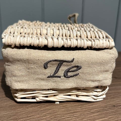 3 tebokser, spisebrikker i tøymateriale og liten kurv, selges!