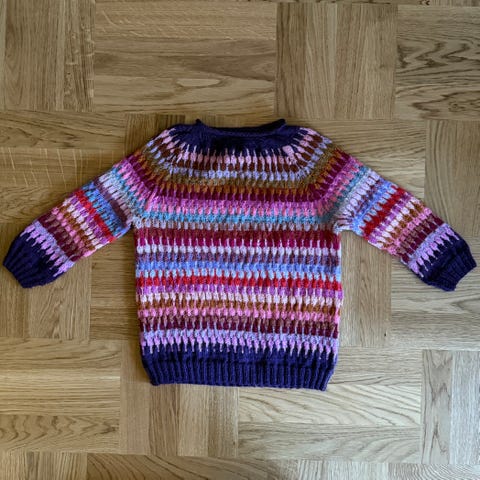 Nystrikket og ubrukt Holger Sweater fra Petiteknit. Størrelse 2-3 år. Strikket i Sandnes garn Double Sunday med fargene: lys nougat, electric blue, poppy og statement green. Vasket og blokket.