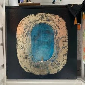 Struktur i perlemor og glitter. Maleriet er nærmest selvlysende og må oppleves. Bør rammes i passpartout og glass som grafikk. Kan også være et stående objekt sånn det er.