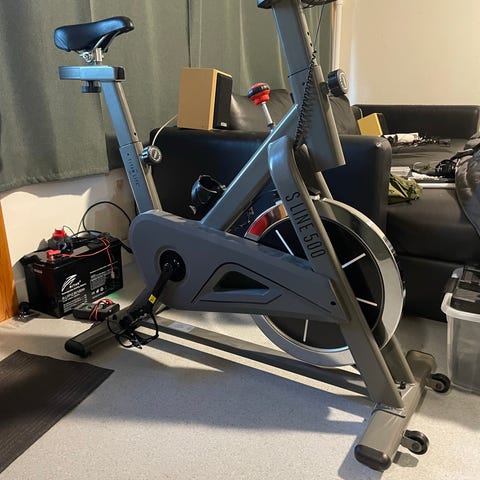 Merida mag pro spinningsykkel med justerbart sete og styre. Sykkelen har pedal med stropp og solid ramme i metall. Designet for innendørs trening med mulighet for tilpasning til brukerens høyde og komfort.
