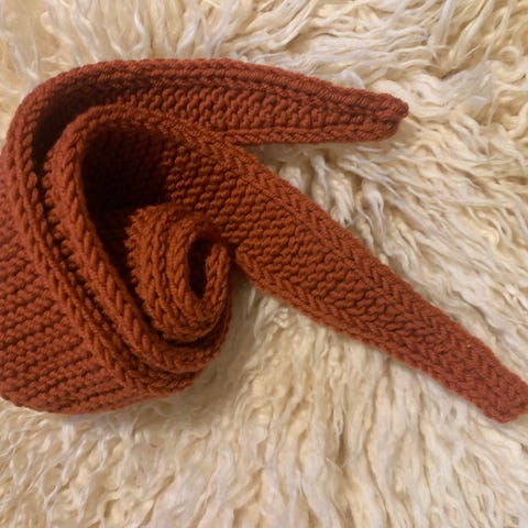 Det lyse skjerfet er alpakkaull, lengde 96 cm, bredde 10 cm.