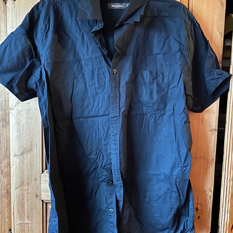 Dressmann skjorte for herre i størrelse XL. Skjorten er blå med små prikker i burgunder og laget av bomull, med et diskret mønster. Den har lang erm og klassisk krage. Passer til formelle og uformelle anledninger.