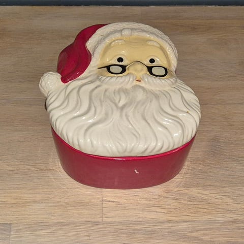 Liggende nissejente har aldersslittasje. Og liten gipsnisse har aldersslittasje. Masse sjarme.