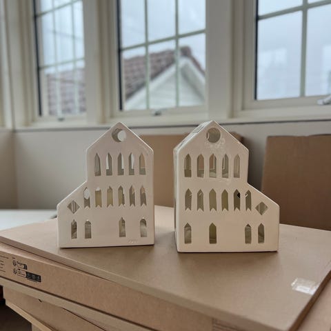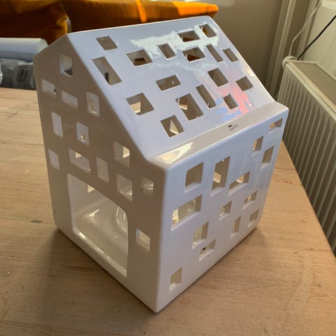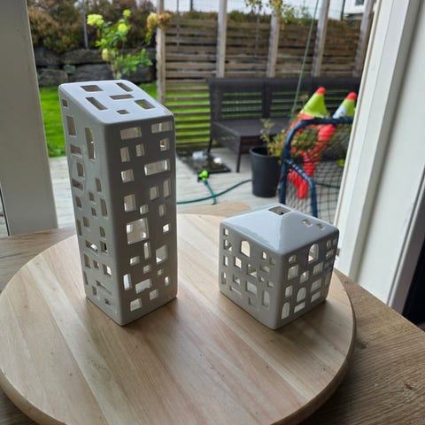 Kähler dekorasjonshus laget i keramikk med hvit farge. Settet består av fire hus i ulike størrelser, designet for dekorative formål i hjemmet.