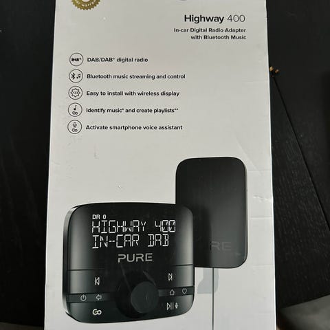 Pure Highway 400 In-Car Digital Radio Adapter med DAB/DAB+ digital radio, Bluetooth musikkstrømming og kontroll. Enkel å installere med trådløst display. Funksjoner inkluderer mulighet for å identifisere musikk og lage spillelister, samt aktivere smarttelefonens stemmeassistent.