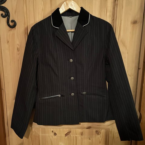 Jacson stevnejakke for dame i mørk blå med rød krage. Jakken er i god stand og er nyrenset. Størrelse 36