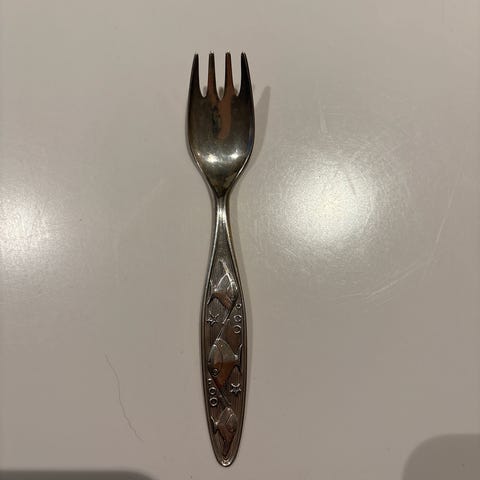 Sølvgaffel laget i 925 sterling sølv. Gaffelen har et unikt design med hjerteformede utskjæringer og veier 29 gram. Gi gjerne bud