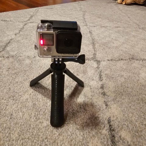 GoPro Hero 8 Black actionkamera med tilbehør inkludert batteri, minnekort, håndholdt grip, og diverse fester. Kameraet har berøringsskjerm og er designet for allsidig bruk i ulike miljøer.