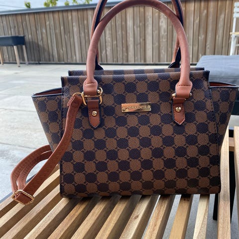 Vesken er i en gylden farge kalt bisquit. Den har stropper i sort lær og er foret i sort tekstil med glidelås. Kjøpt hos O bag nær Campo dei Fiori i Roma.