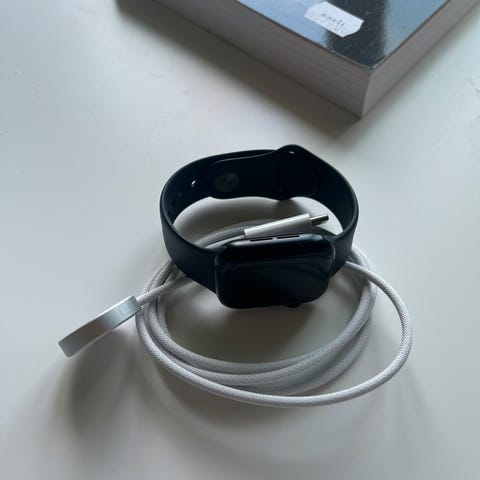 Samsung Galaxy Watch4 smartklokke med svart rem. Produktet er egnet for bruk som aktivitetsmåler og smartklokke med flere funksjoner for helse og kommunikasjon.