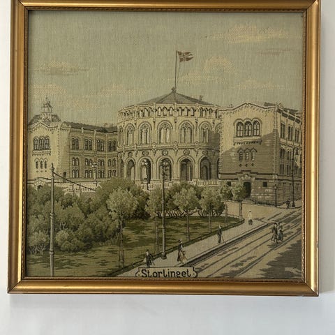 Sjeldent sett med tre håndbroderte tekstiler i Art Deco-stil, utført i silke på tykt linlerret. Arbeidene er preget av geometriske mønstre, stram komposisjon og høy håndverksmessig kvalitet, typisk for perioden.