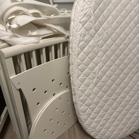 Stokke Sprinkelseng V2 i tre med naturlig trefinish. Sengen har spiler rundt hele, og er designet for barn. Passer til barnerom og gir en trygg soveplass for spedbarn. Mangler et sett med skruer, kan lett kjøpes i butikken eller på stokkes egen sider