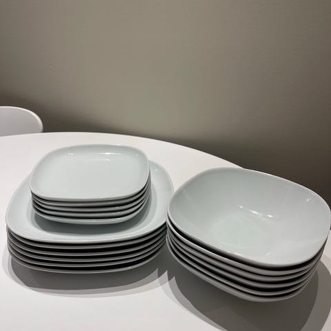 IKEA tallerkener laget av hvit porselen. Passer til bruk i kjøkken og servering. Kvadratiske med avrundede hjørner, egnet for ulike måltider.