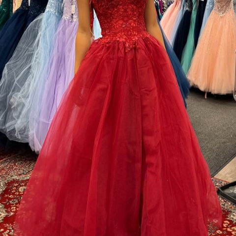 Nydelig ballkjole med ermer til leie. Kan bæres som tubetopp kjole, off-shoulder eller bare vanlige stropper.