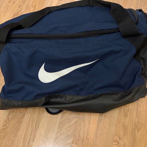 Nike treningsbag med flere rom og lommer, inkludert et rom med glidelås og et nettrom på siden. Den har både håndtak og avtagbar skulderrem for bæring.