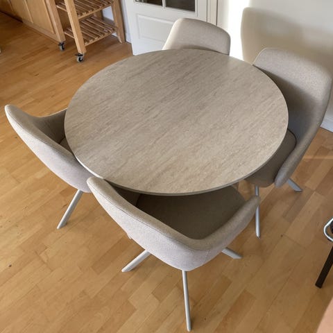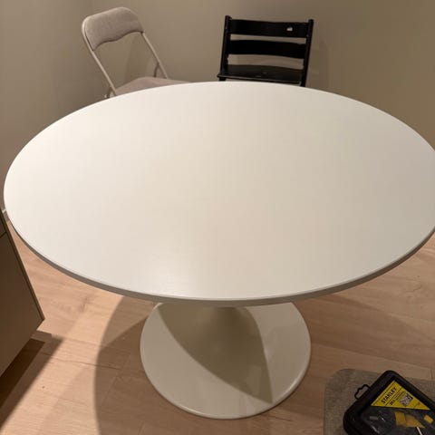 Godt brukt, flere synlige bruksmerker på bordet og stolene. Se bilder på dette. Har vært skjult med bordduk uten problem. Stolene har vært malt hvite, de små bruksmerkene på stolene kan helt sikkert skjules ved å male om. Selges samlet.