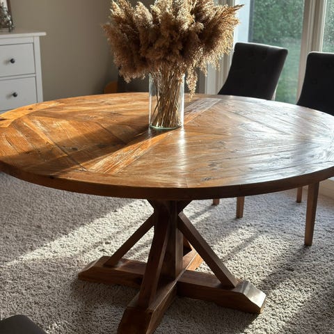 Nydelig stort spisebord i heltre eik med to klaffer. Med klaffene ute er bordet 320 cm og gir god plass til et stort selskap. Vi har sittet 14 personer rundt bordet uten problemer. Bordet er nylig voksbehandlet og har en fin glans.