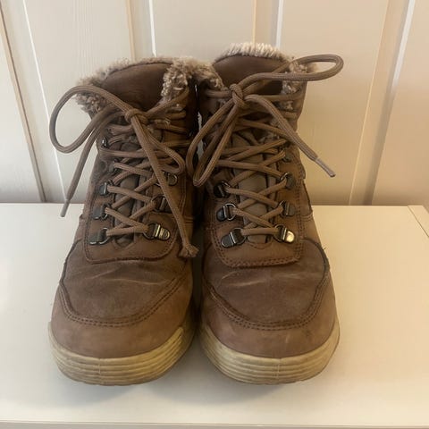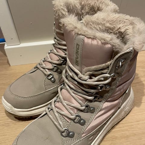 Fra Euroskos nettside: "City Walk er en sporty og anvendelig høst-/vintersko med vanntett og pustende Sympatex-membran. Overdelen har tekstil i kombinasjon med mer forsterkende materialer. Dette gjør skoen letterere og ekstra komfortabel, samtidig som den er slitesterk. Det ankelhøye skaftet og det varme fôret gjør at man holder seg ekstra varm på føttene over lang tid. Innersålen er laget i ekte ull, og den holder godt på varmen. Yttersålen er lett, støtdempende og komfortabel, og har et svært godt grep under. Den bærekraftige Sympatex-membranen gjør at skoen er 100% vanntett og pustende." Disse er svært pent og lite brukt.
