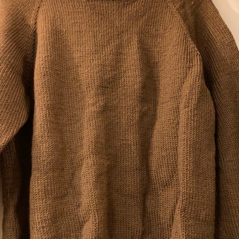 Selger håndstrikket genser i patentmønster. Strikket i garnet Sky fra Drops. Genseren har liten v-utringing og trekvart lange armer. Lengde ca 60 cm. Ermelengde 32 cm. Farge svart med litt grått i.