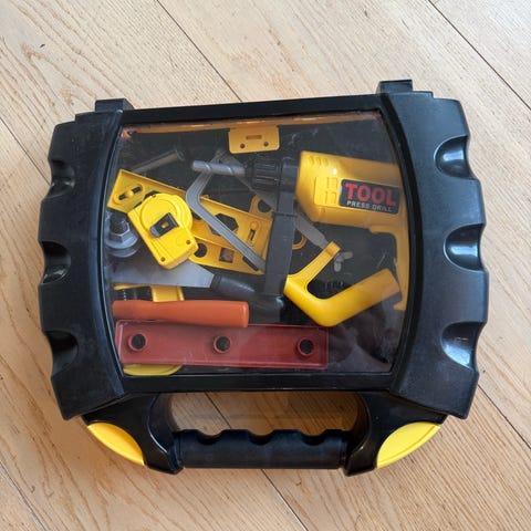 Masse ulikt lekeverktøy i en koffert som er enkel å bære med seg. Passer for små barn, verktøyet kan ikke brukes på ordentlig.