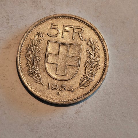 Belgia 5 Francs mynt fra 1949 med motiv av en kvinne og et eikekvistmotiv under kronen. Mynten er laget av metall.