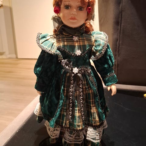 Porselensdukke 50 cm. Står av seg selv pga inkludert stativ.