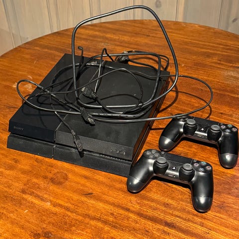 PlayStation 4 med spill. PlayStation trenger et nytt hjem etter en oppdatering under juletreet. Den fungerer som den skal og den ble brukt helt til juleaften uten noen problem. Kontrollen er godt brukt, men fungerer. Konsollen er fabrikk resettet.