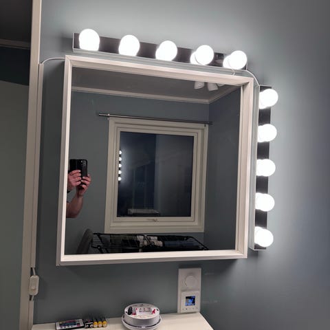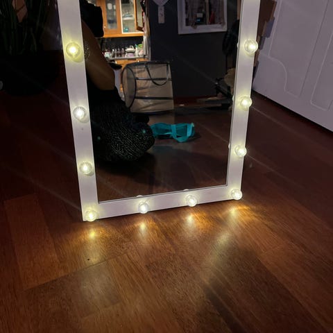 Brukt Chatgpt til å lage bilde av hvordan det ser ut (bare med 5 pærer istedenfor 4 på hver side). Har ikke bilde av at det er hengt opp. Flyttet og får ikke sku i vegg så derfor kjøpt nytt sminkespeil.