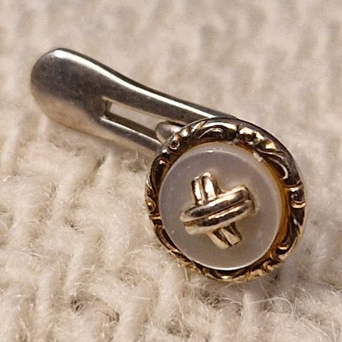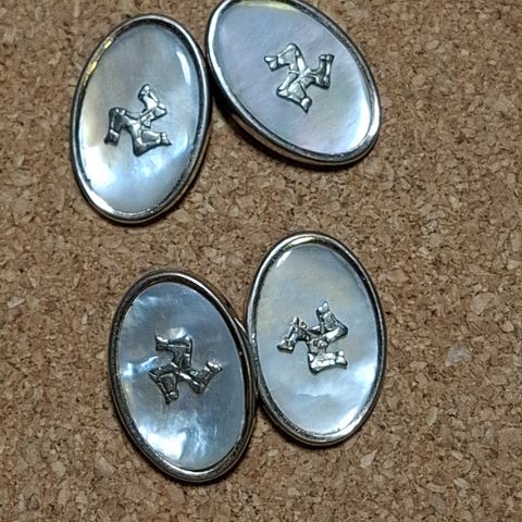 Eldre skjorteknapper i sølv og enten ekte eller kunstig perlemor selges. Art Deco-stil. Passer til smoking og kjole og hvitt. Knappene er stemplet 830S og utydelig mestermerke. Knappene er ca. 8 x 6 millimeter. Bildene har litt gjenskinn fra lyset og fra kamera.