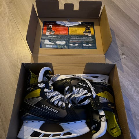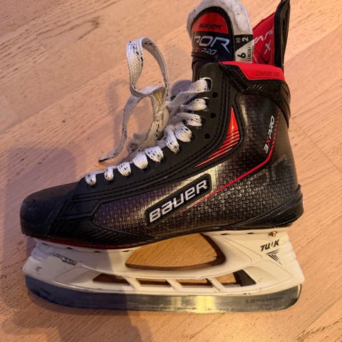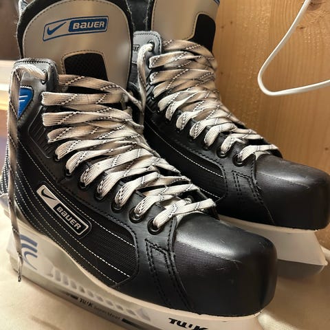 Bauer Stealth ishockeyskøyter i størrelse 42. Skøytene har en kombinasjon av grå, svart og røde farger, med hvite skøyteblader. Egnet for ishockey. Str 7
