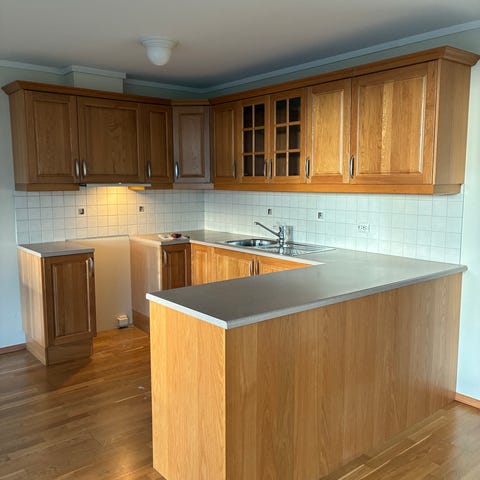 Selger vår ca 20år gammle Eik kjøkkeninnredning fra Friestad kjøkken. Selger med hjørnekjøle, bakeovn, ventilatorhette, og koketopp. (Oppvaskemaskin og micro følger ikke med)
