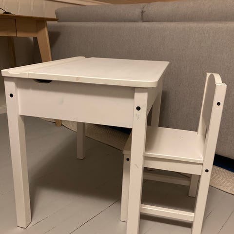 Pent brukt Sundvik skrivebord med oppbevaring og kritter barnestol.