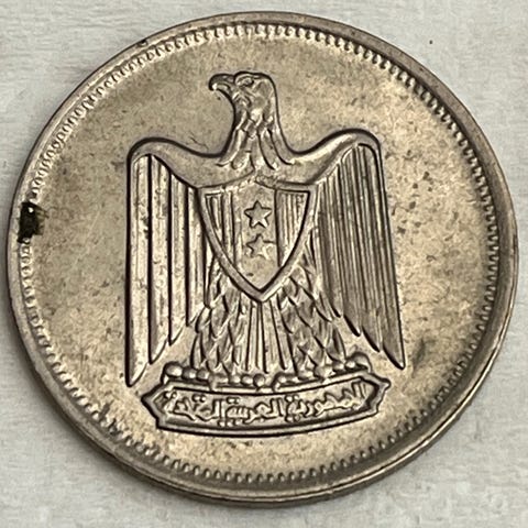 Egyptisk 5 Piastres mynt fra 1968. Mynten har innskrifter på arabisk og viser et portrett på den ene siden og et våpenskjold på den andre siden.